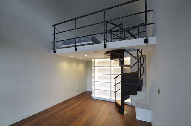 Thomson Brothers have just completed this complex project which included installing a mezzanine level in the barrel vaulted upper penthouse room. Below the mezzanine is a compact shower room that doubles as an en-suite WC taking it’s inspiration from nautical space saving Shower/WC cubicles found on yachts. The design of the spiral staircase matches the existing black metal balustrades of the flats main staircase; the folded metal and hardwood tread design being taken from an original Barbican spiral staircase found in John Trundle Court which we used as a reference. Scroll down for more images, click on any image for a larger view.