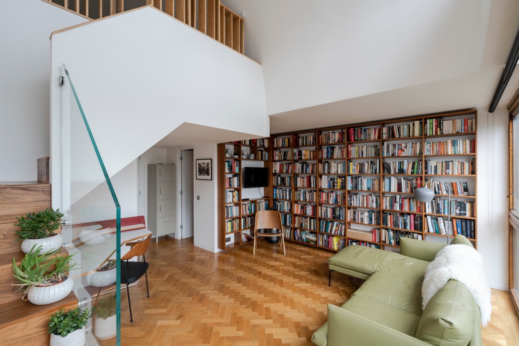 This comprehensive refurbishment by Thomson Brothers, not only revitalised the living space, but also introduced a third floor in the form of a remarkable mezzanine, reached by ascending a beautiful bespoke walnut staircase with a sleek glass balustrade. This new focal point of the apartment was strategically designed to maximise space without compromising aesthetics. Bespoke storage beneath the new staircase ingeniously makes the most of the available space, effortlessly integrating functionality with a tailored design that adds practicality and aesthetic appeal to the area.
