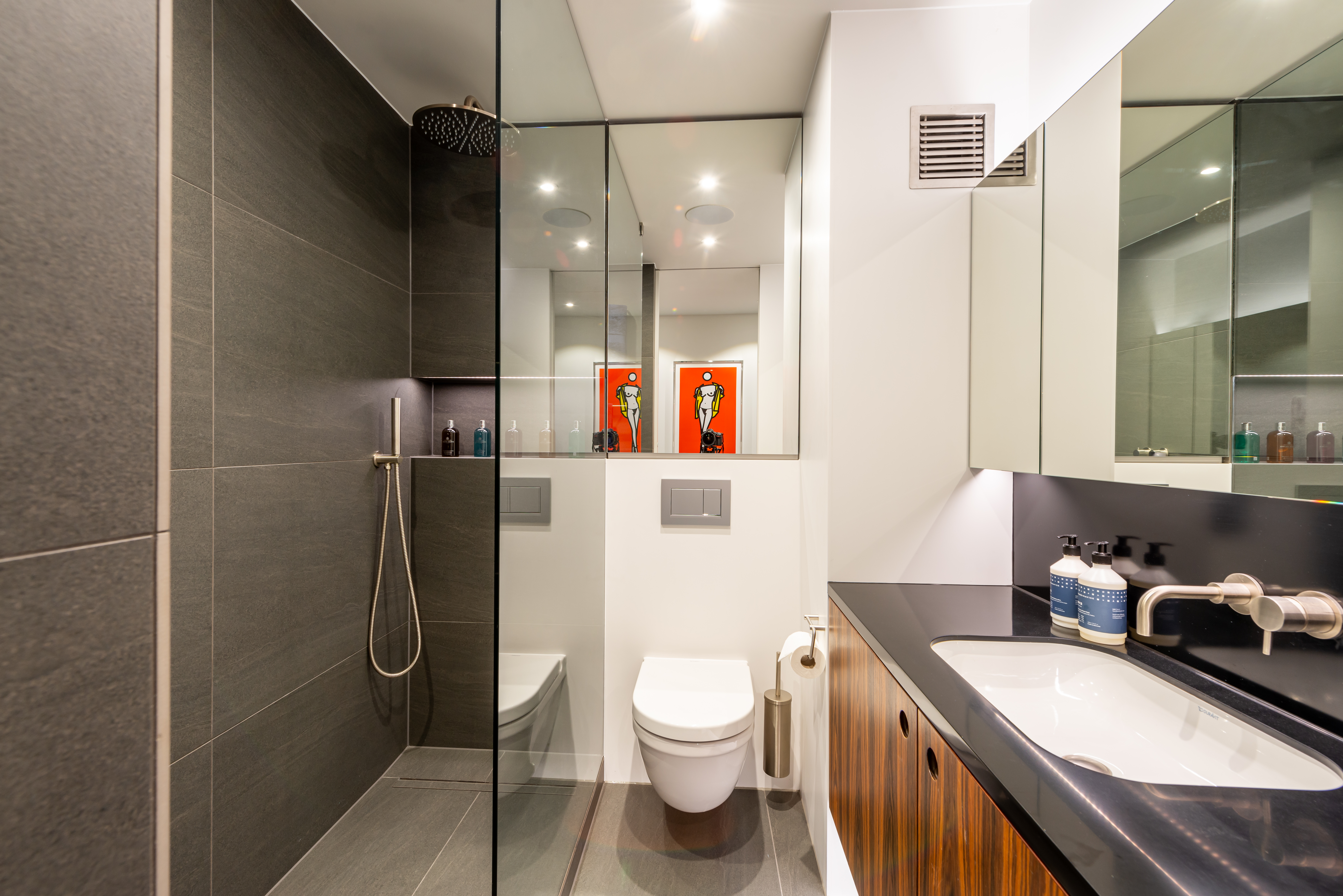 Smoothly sliding the bathroom door to one side, reveals a sleek sanctuary of luxury. The bespoke rosewood vanity cabinet, with a polished black Himacs top takes centre stage against the large anthracite porcelain tiles. The strategic design features of the bespoke wall cabinets with mirrored doors, along with an inbuilt niche within the large walk-in shower area, give an enhanced sense of spaciousness while providing ample storage. A heated wall with rails ensures that towels are conveniently located within easy reach of the shower.