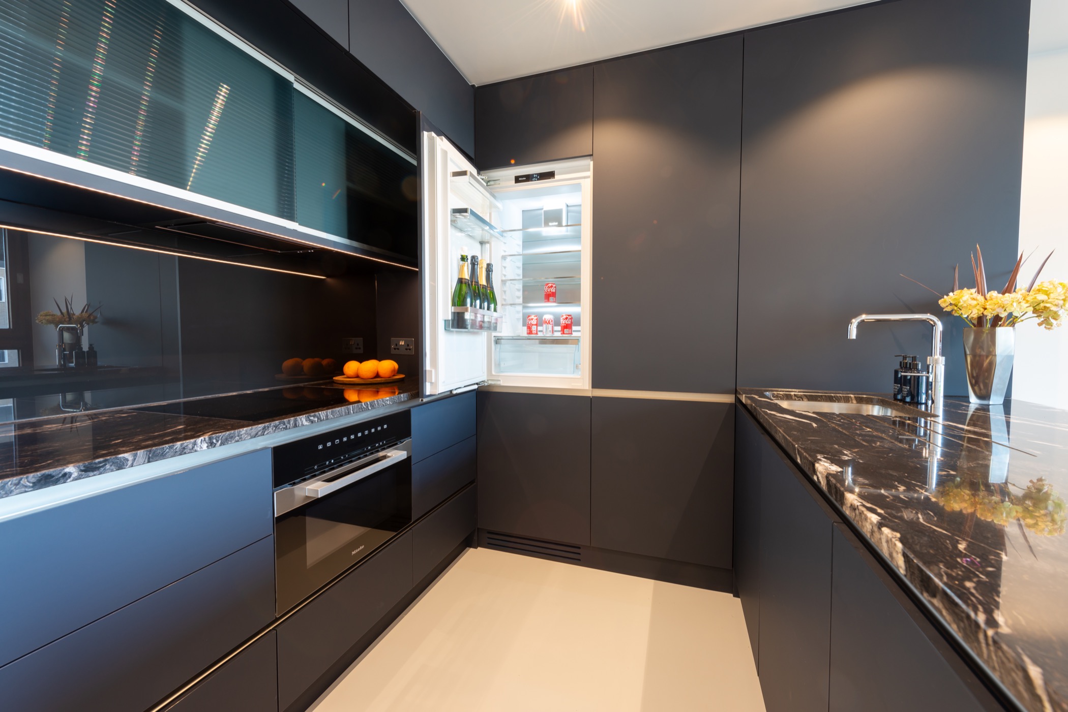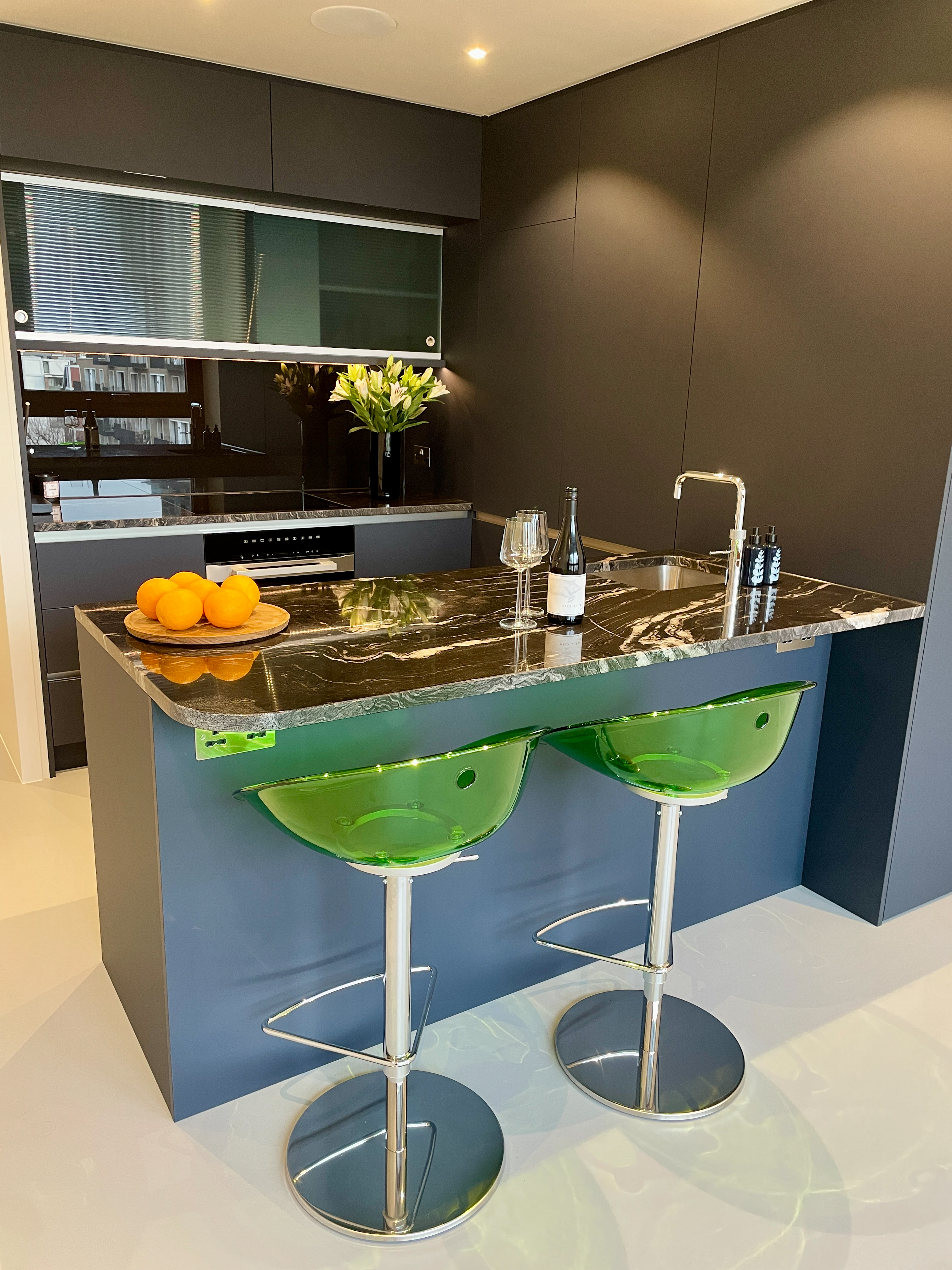 The fully refurbished kitchen exudes sophistication along with functionality. The bespoke wood cabinets, meticulously crafted and finished with a dark, matte anti-fingerprint paint, not only enhances the aesthetic appeal, but also ensures durability and easy maintenance for years to come. The stunning dark granite work surface provides a spacious food preparation area. Its extension to incorporate a sleek breakfast bar is enhanced by the addition of the two vibrant green high stools. One of the kitchen’s modern conveniences is the Quoker tap. A true marvel of technology, the tap offers filtered, sparkling and hot water instantly. The kitchen has been transformed with luxury materials, thoughtful design and innovative features into a stunning space not just for cooking but also casual dining, drinks with friends and an inspiring space to work from home.
