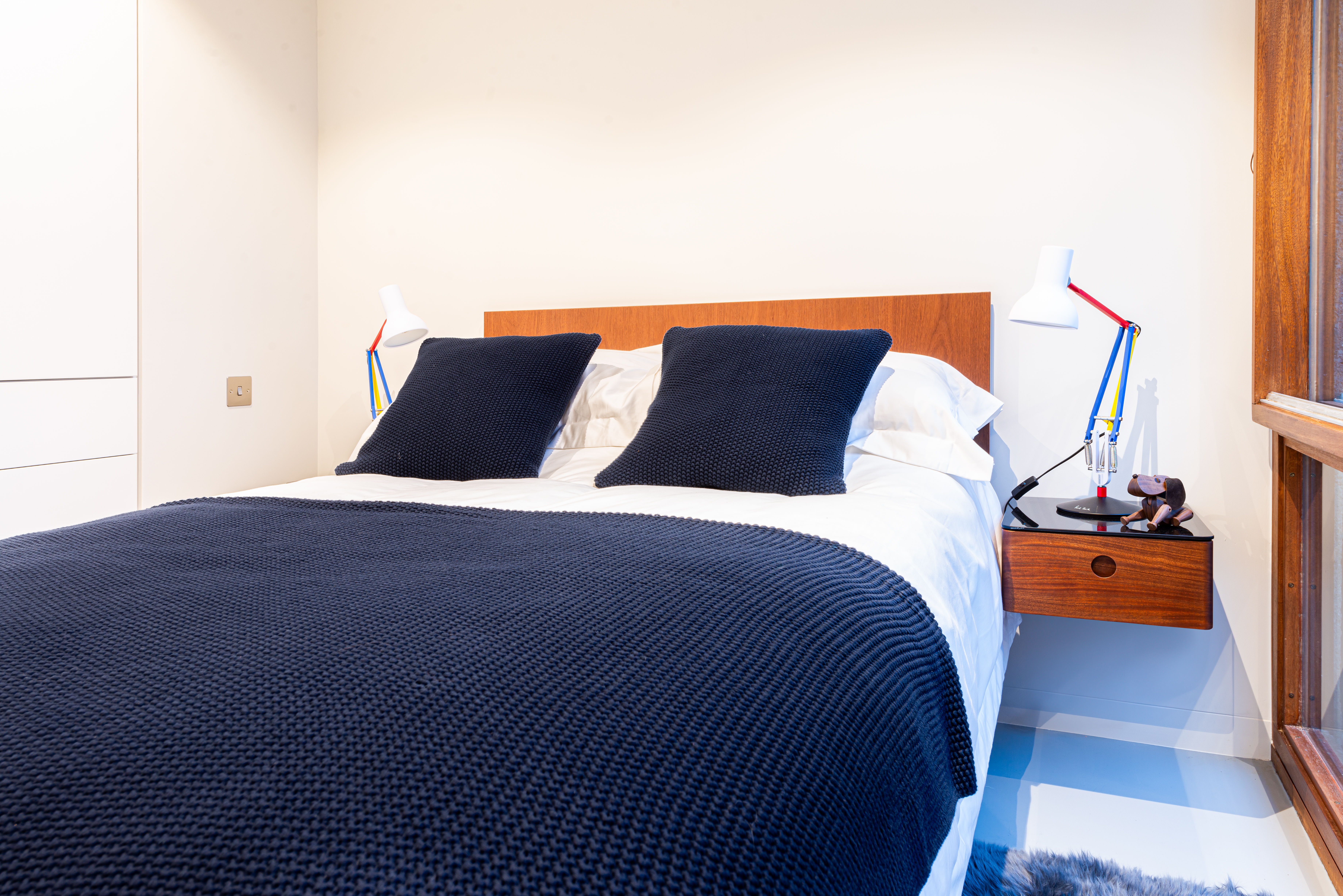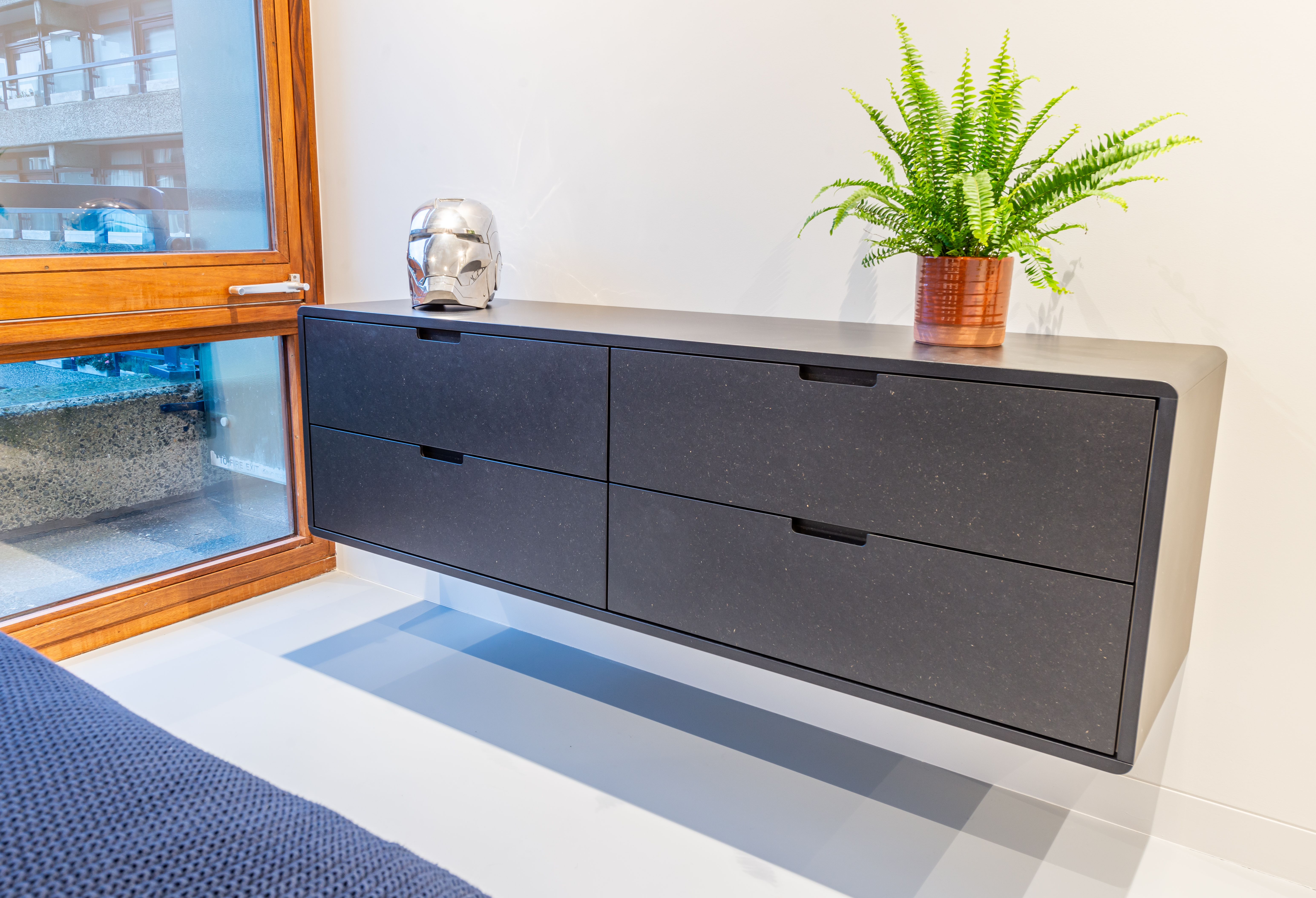 The bedroom is a true sanctuary for rest and relaxation. A beautifully rich-toned, bespoke floating sapele bed, exudes modern simplicity, along with showcasing Thomson Brothers’ meticulous craftsmanship. The concealed pull-out drawer beneath the bed provides a discreet storage solution for linens and extra bedding. With its elegant design, the bed appears to hover effortlessly above the floor. Flanking either side of the bed are two matching bespoke sapele bedside tables. The perfectly polished black glass tops add a layer of refinement, as well as practicality to the overall design. The Thomson Brothers’ bespoke black Valcromat drawer cabinet, gracefully mounted on the wall, complements the custom-built wardrobe and drawers, providing ample storage for clothes.