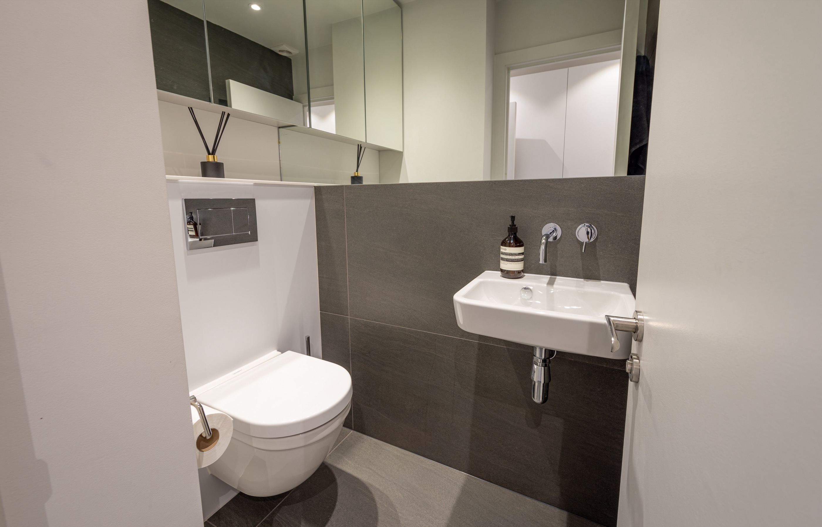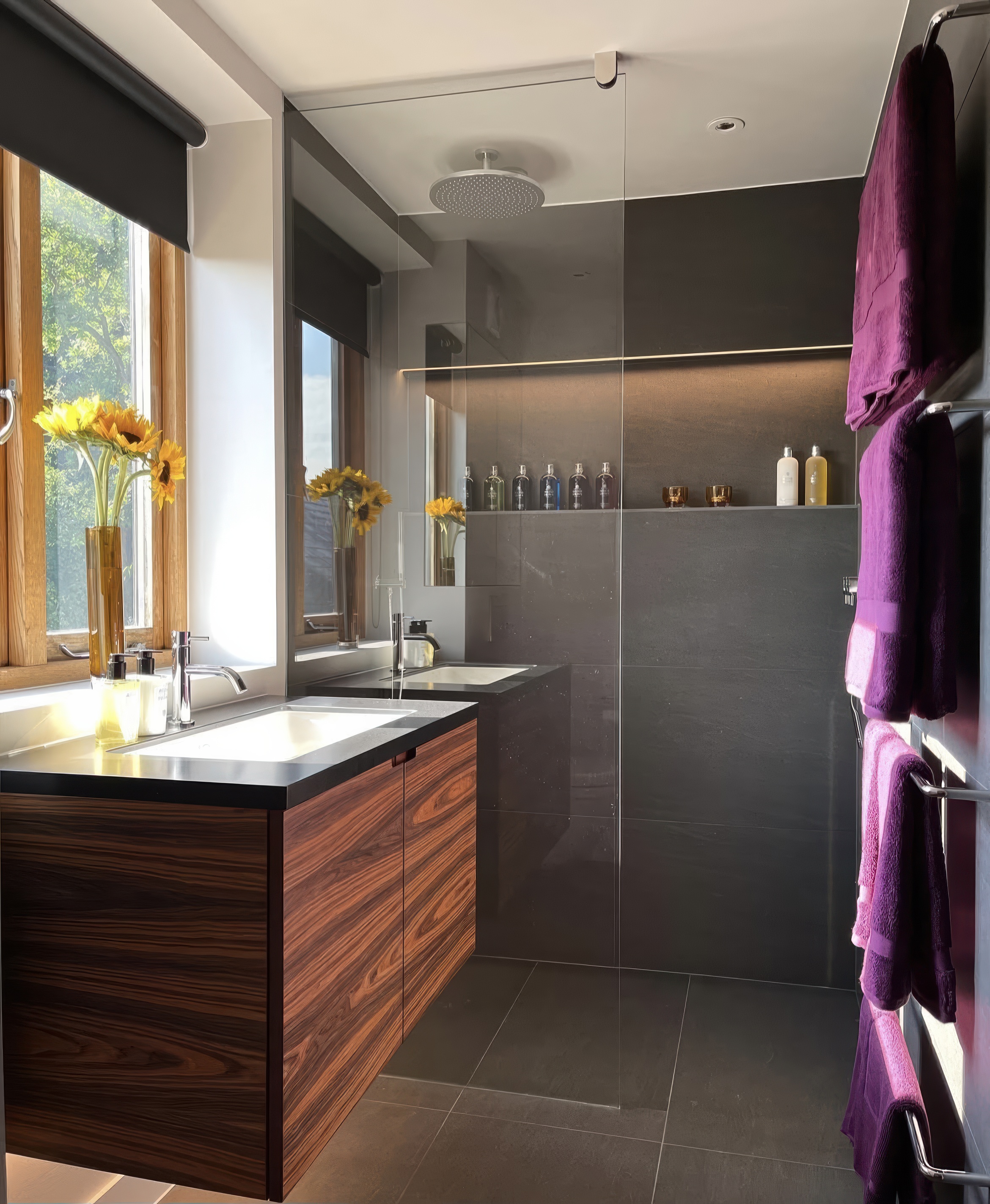 All of the home’s bathrooms, shower rooms and cloakrooms have been transformed with an emphasis on sleek, modern luxury. Large-format anthracite porcelain tiles create a sophisticated backdrop, while rainfall showers with expansive heads provide a spa-like experience. Two of the bathrooms now feature exquisite bespoke walnut wall-hung vanity cabinets, adding warmth and refinement. Another bathroom additionally benefits from a large, wall-hung bespoke mirrored cabinet, providing ample storage without compromising on style.