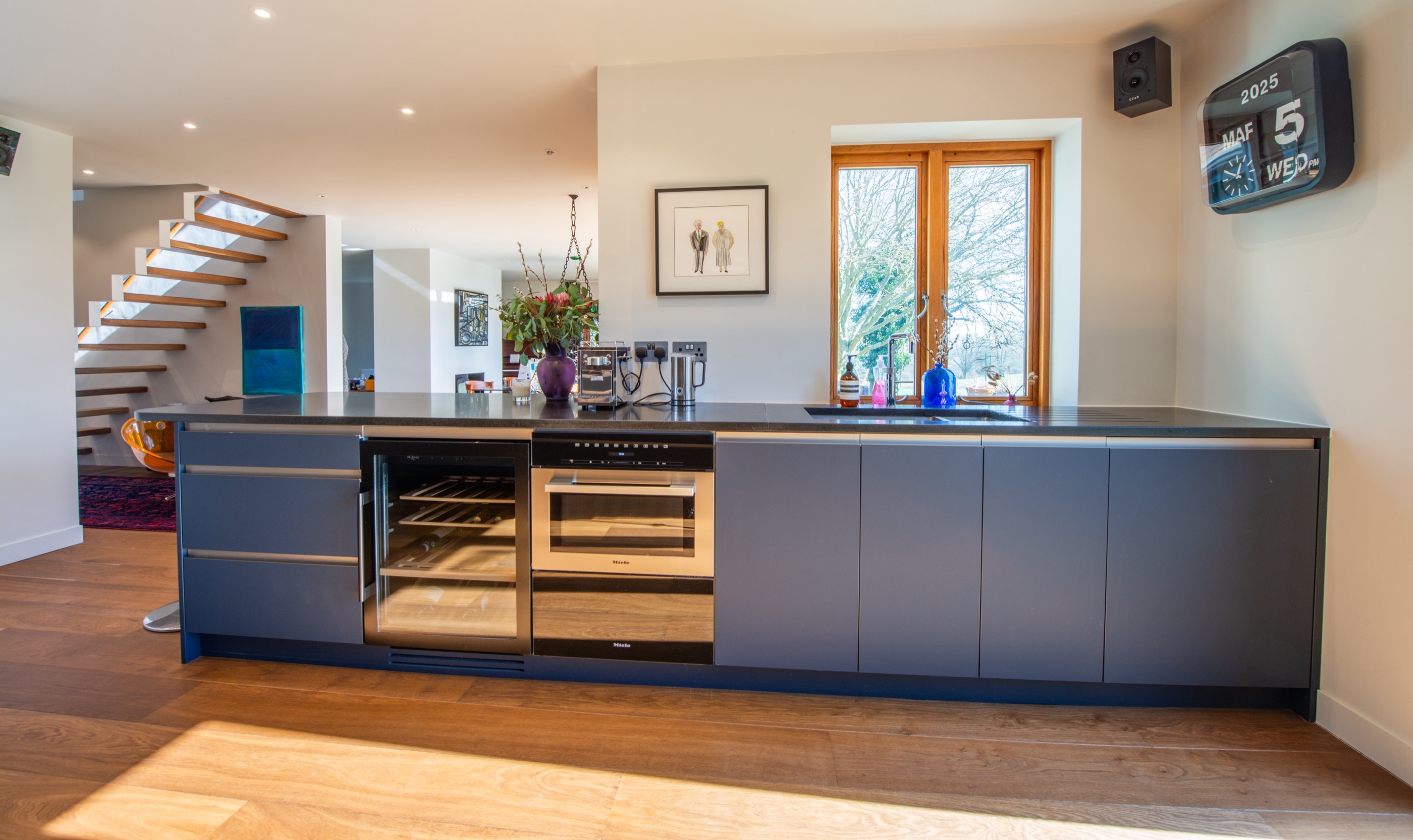 The kitchen transformation thoughtfully incorporates elements from the original design. The existing black honed granite worktops were given a fresh lease of life by re-polishing the surfaces and reshaping the squared corners of the main surface area into soft, rounded corners. These now sit harmoniously alongside dark blue, anti-fingerprint, matt finish bespoke cabinets, each fitted with sleek linear aluminium handles.